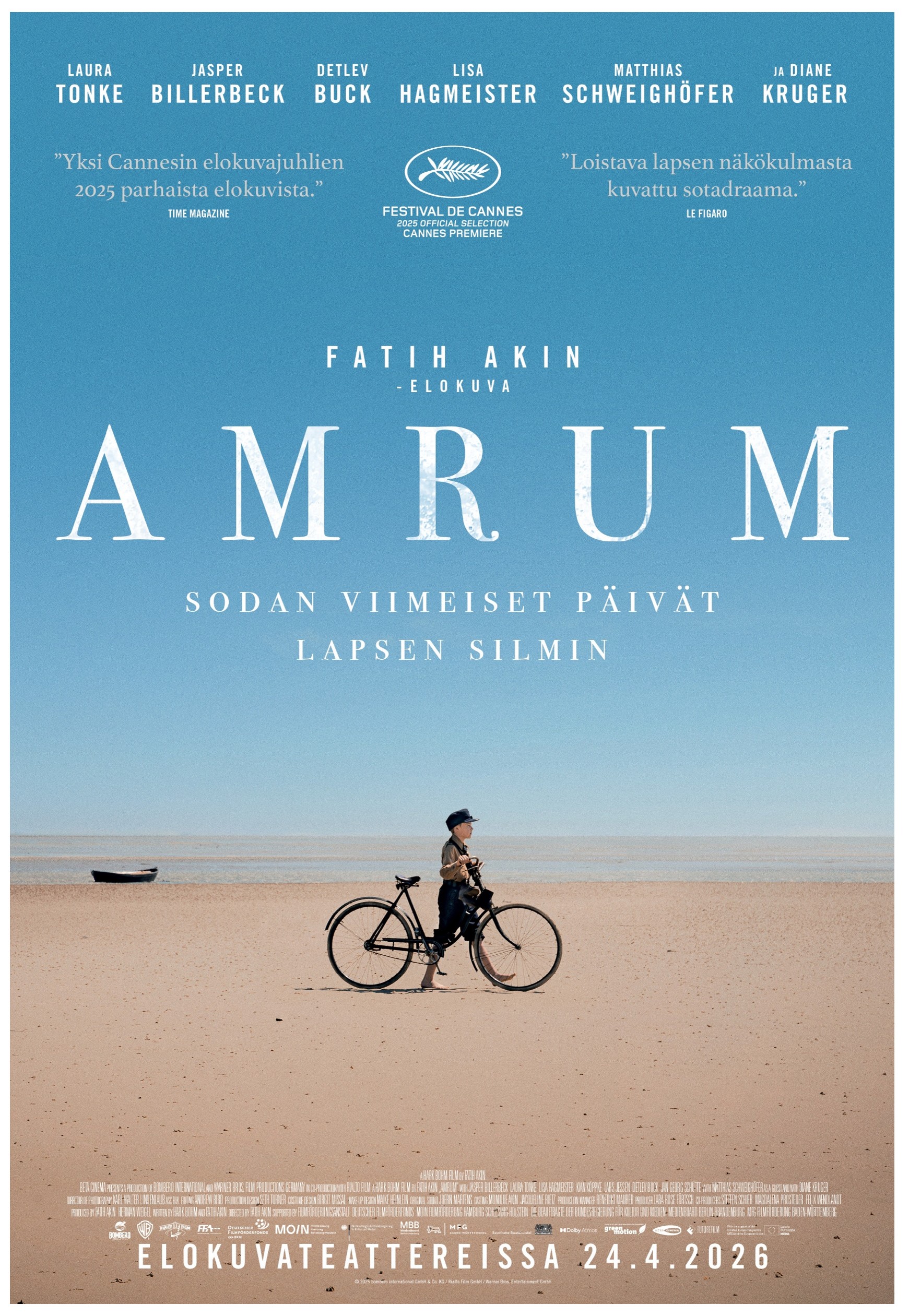 Fatih Akinin (”Suoraan seinään”, ”Kuin tyhjästä”) ohjaama ”Amrum – Sodan viimeiset päivät lapsen silmin” on koskettava, historiallinen kasvutarina, joka pohjautuu käsikirjoittaja Hark Bohmin omakohtaisiin sota-ajan kokemuksiin. Elokuvan rooleissa nähdään muun muassa Cannesissa parhaan naisnäyttelijän palkinnon voittanut Diane Kruger sekä Laura Tonke ja Jasper Billerbeck.