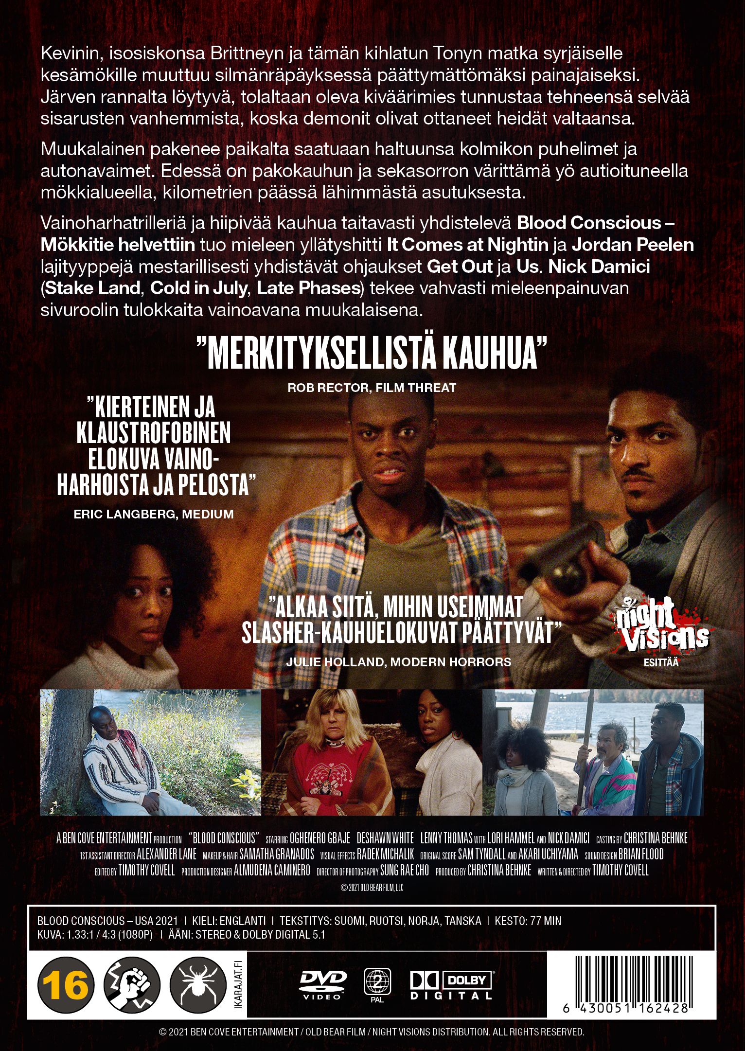 Vainoharhatrilleriä ja hiipivää kauhua taitavasti yhdistelevä Blood Conscious – Mökkitie helvettiin tuo mieleen yllätyshitit It Comes at Nightin ja Jordan Peelen lajittyyppejä mestarillisesti yhdistelevät ohjaukset Get Out ja Us. Nick Damici (Stake Land, Cold in July, Late Phases) tekee vahvasti mieleenpainuvan sivuroolin tulokkaita vainoavana muukalaisena.