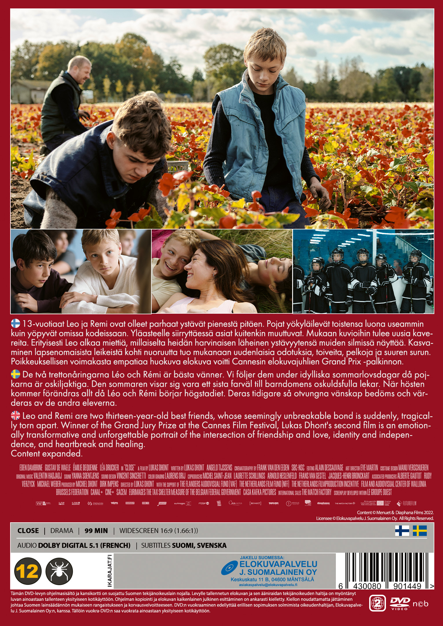 Elokuvan ensi-ilta vuoden 2022 Cannesin elokuvajuhlilla innoitti yleisön taputtamaan pitkään seisaallaan ja liikutti yleisöä vahvasti esityksestä toiseen. Poikkeuksellisen voimakasta empatiaa huokuva elokuva voitti Cannesin elokuvajuhlien Grand Prix -palkinnon. Myös Dhontin ensimmäinen ohjaustyö ”Girl” palkittiin Cannesissa Camera D’Or-palkinnolla vuonna 2018. ”Close” oli parhaan kansainvälisen elokuvan Oscar-ehdokas 2022.
