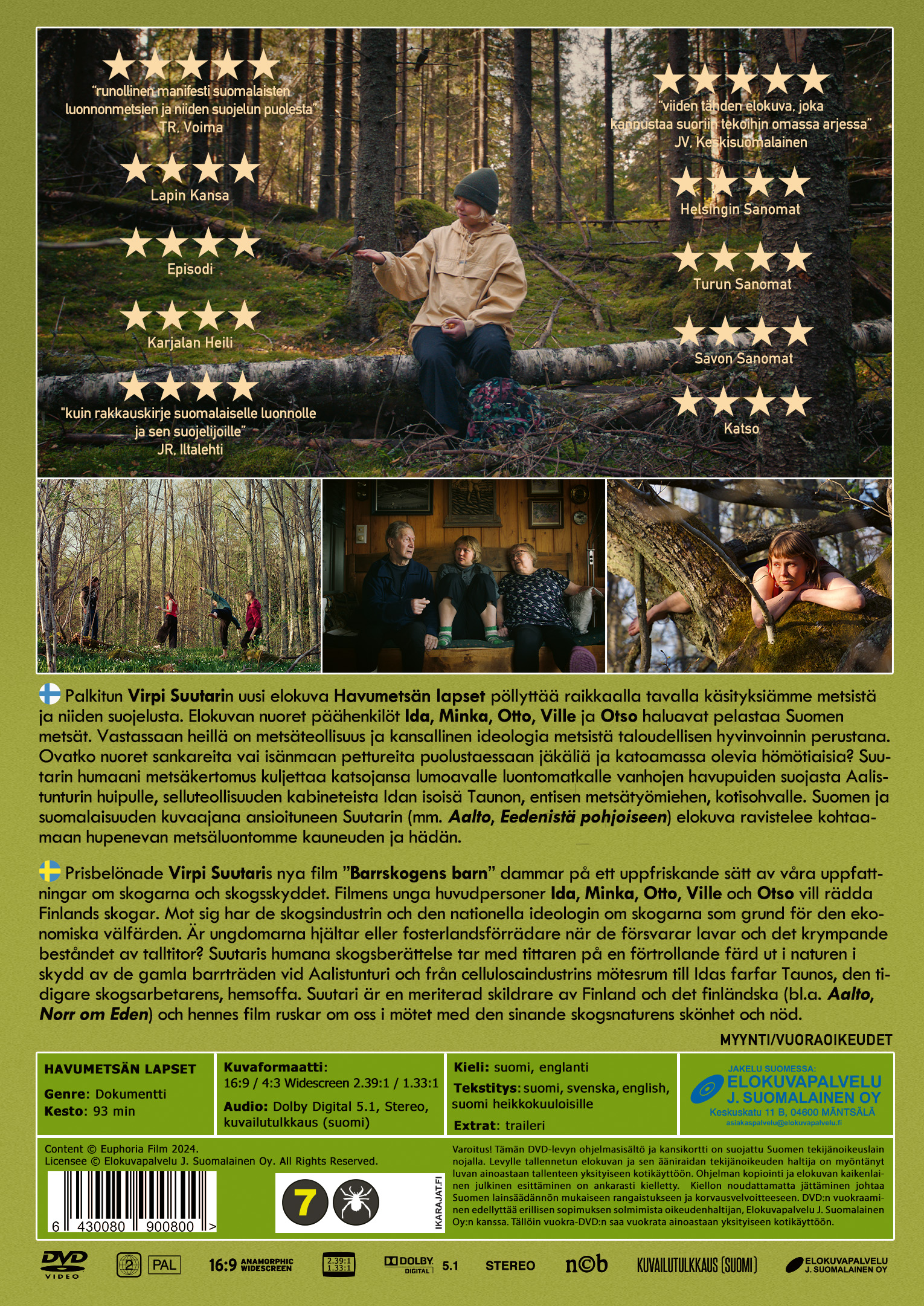 Palkitun Virpi Suutarin uusi elokuva ”Havumetsän lapset” pöllyttää raikkaalla tavalla käsityksiämme metsistä ja niiden suojelusta. Elokuvan nuoret päähenkilöt Ida, Minka, Otto, Ville ja Otso haluavat pelastaa Suomen metsät. Vastassaan heillä on metsäteollisuus ja kansallinen ideologia metsistä taloudellisen hyvinvoinnin perustana. Ovatko nuoret sankareita vai isänmaan pettureita puolustaessaan jäkäliä ja katoamassa olevia hömötiaisia? Suutarin humaani metsäkertomus kuljettaa katsojansa lumoavalle luontomatkalle vanhojen havupuiden suojasta Aalistunturin huipulle, selluteollisuuden kabineteista Idan isoisä Taunon, entisen metsätyömiehen, kotisohvalle. Suomen ja suomalaisuuden kuvaajana ansioituneen Suutarin (mm. ”Aalto”, ”Eedenistä pohjoiseen”) elokuva ravistelee kohtaamaan hupenevan metsäluontomme kauneuden ja hädän.
