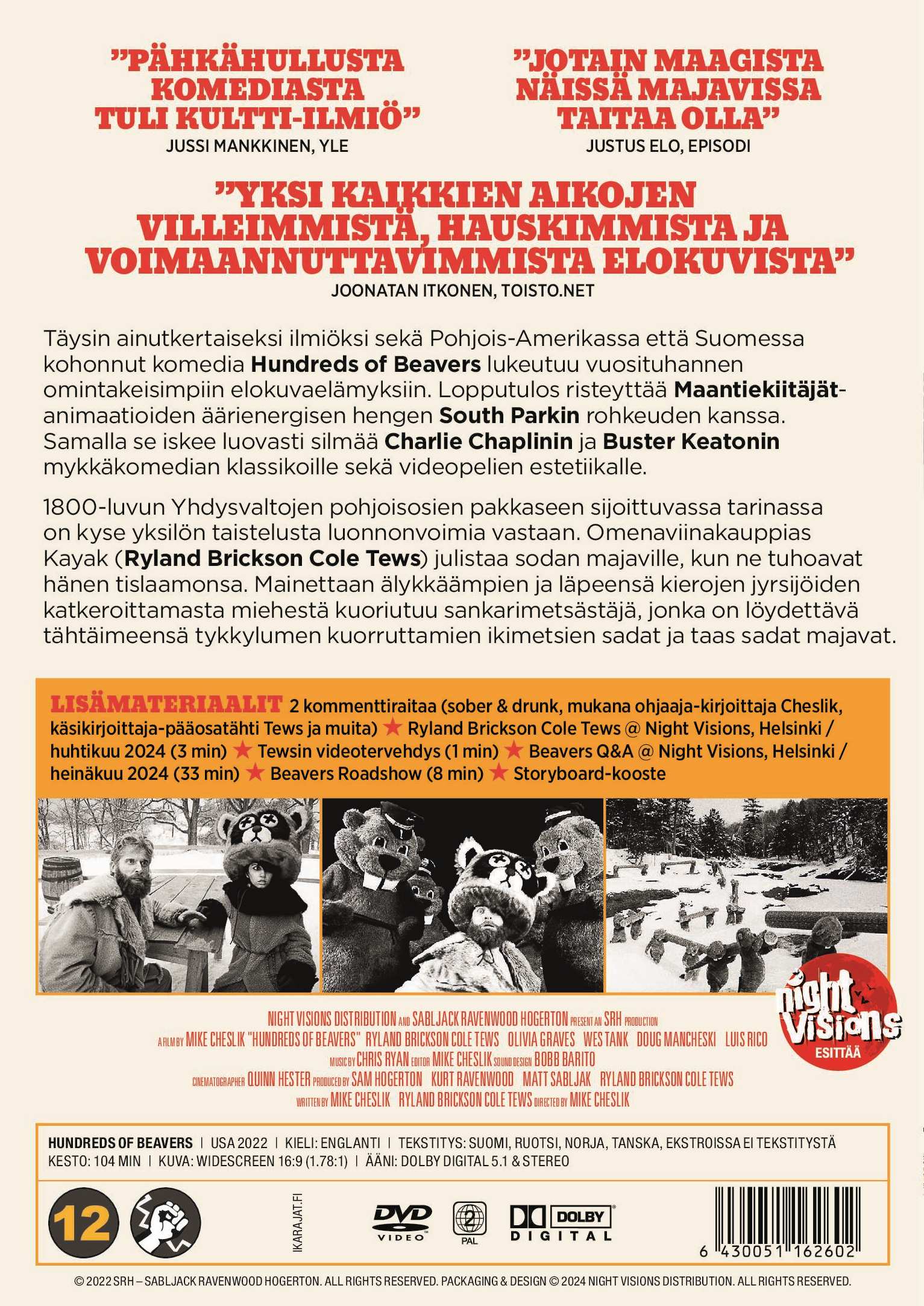 Täysin ainutkertaiseksi ilmiöksi sekä Pohjois-Amerikassa että Suomessa kohonnut komedia Hundreds of Beavers lukeutuu vuosituhannen omintakeisimpiin elokuvaelämyksiin. Lopputulos risteyttää Maantiekiitäjät-animaatioiden äärienergisen hengen South Parkin rohkeuden kanssa. Samalla se iskee luovasti silmää Charlie Chaplinin ja Buster Keatonin mykkäkomedian klassikoille sekä videopelien estetiikalle.
