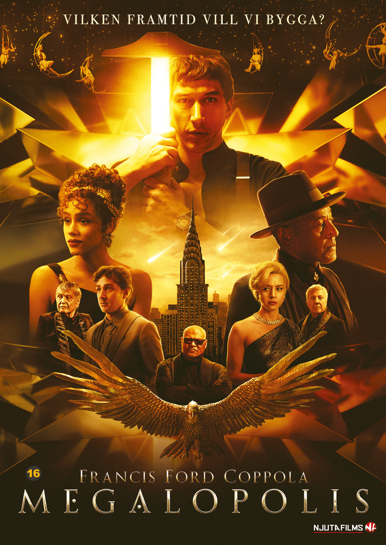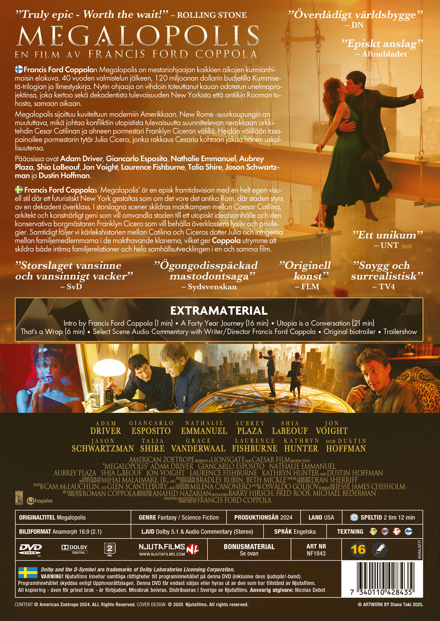 Francis Ford Coppolan Megalopolis on mestariohjaajan kaikkien aikojen kunnianhimoisin elokuva. 40 vuoden valmistelun jälkeen, 120 miljoonan dollarin budjetilla Kummisetä-trilogian ja Ilmestyskirja. Nytin ohjaaja on vihdoin toteuttanut kauan odotetun unelmaprojektinsa, joka kertoo sekä dekadentista tulevaisuuden New Yorkista että antiikin Rooman tuhosta, samaan aikaan.