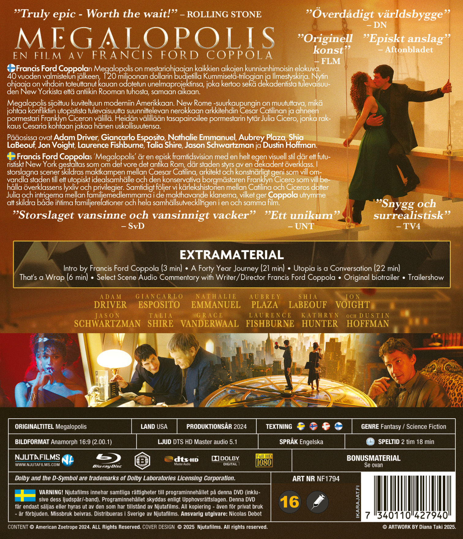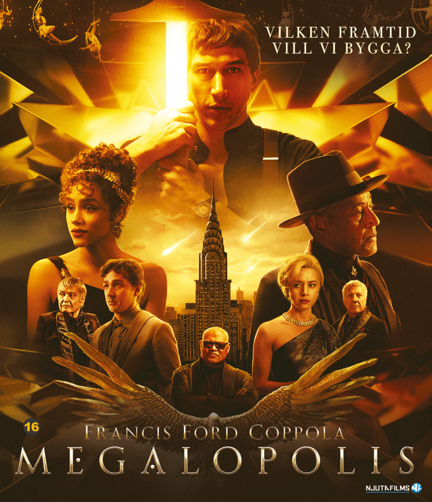Francis Ford Coppolan Megalopolis on mestariohjaajan kaikkien aikojen kunnianhimoisin elokuva. 40 vuoden valmistelun jälkeen, 120 miljoonan dollarin budjetilla Kummisetä-trilogian ja Ilmestyskirja. Nytin ohjaaja on vihdoin toteuttanut kauan odotetun unelmaprojektinsa, joka kertoo sekä dekadentista tulevaisuuden New Yorkista että antiikin Rooman tuhosta, samaan aikaan.