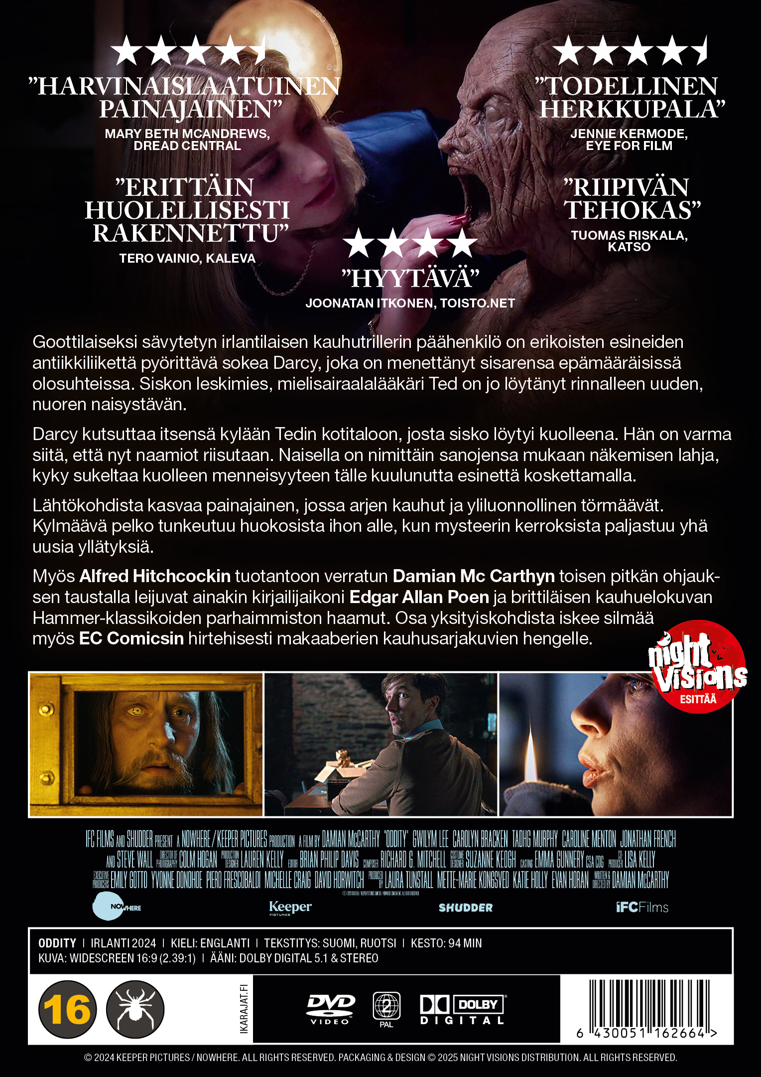 Myös Alfred Hitchcockin tuotantoon verratun Damian Mc Carthyn toisen pitkän ohjauksen taustalla leijuvat ainakin kirjailijaikoni Edgar Allan Poen ja brittiläisen kauhuelokuvan Hammer-klassikoiden parhaimmiston haamut. Osa yksityiskohdista iskee silmää myös EC Comicsin hirtehisesti makaaberien kauhusarjakuvien hengelle.