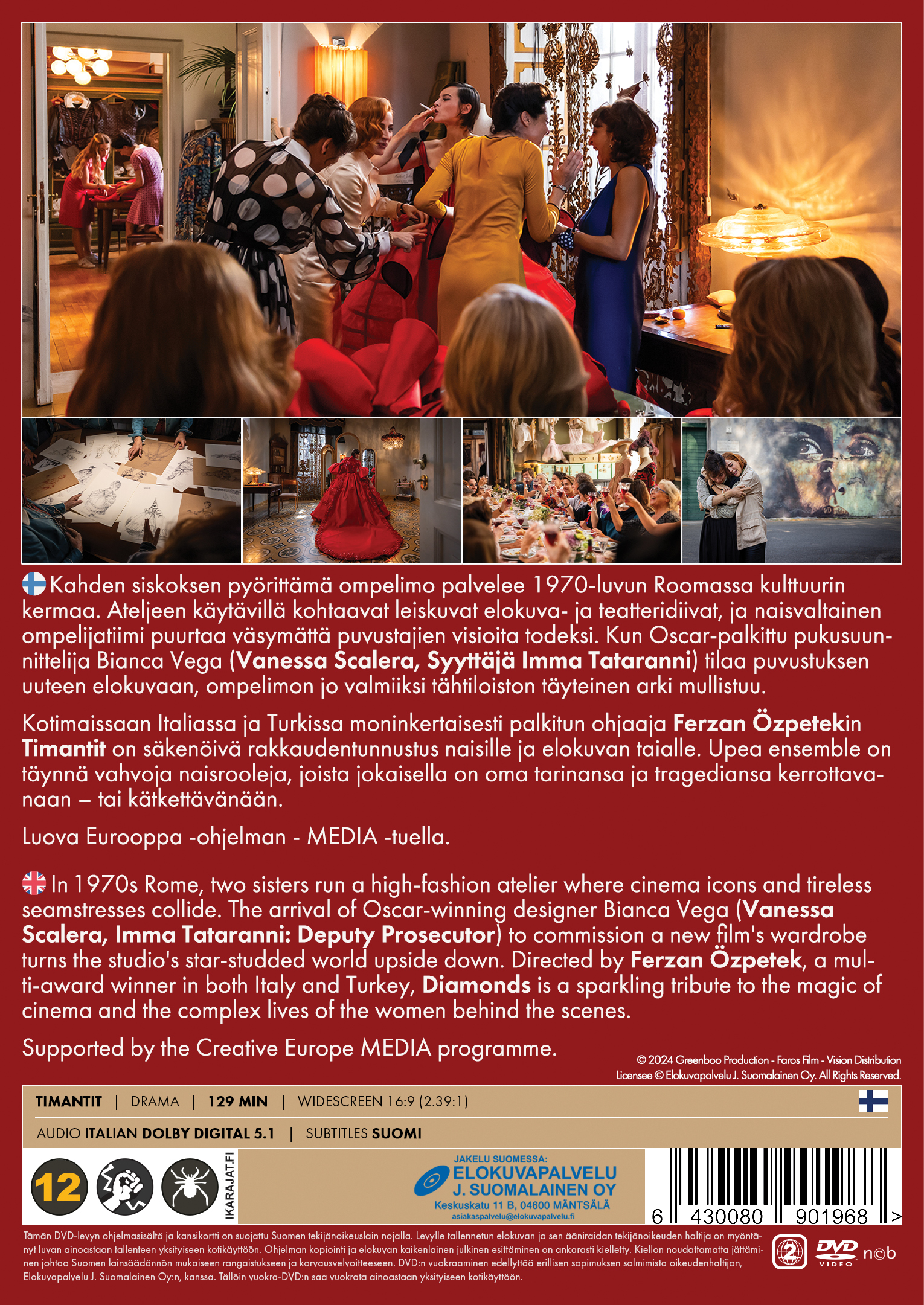 Kotimaissaan Italiassa ja Turkissa moninkertaisesti palkitun ohjaaja Ferzan Özpetekin ”Timantit” on säkenöivä rakkaudentunnustus naisille ja elokuvan taialle. Upea ensemble on täynnä vahvoja naisrooleja, joista jokaisella on oma tarinansa ja tragediansa kerrottavanaan – tai kätkettävänään.